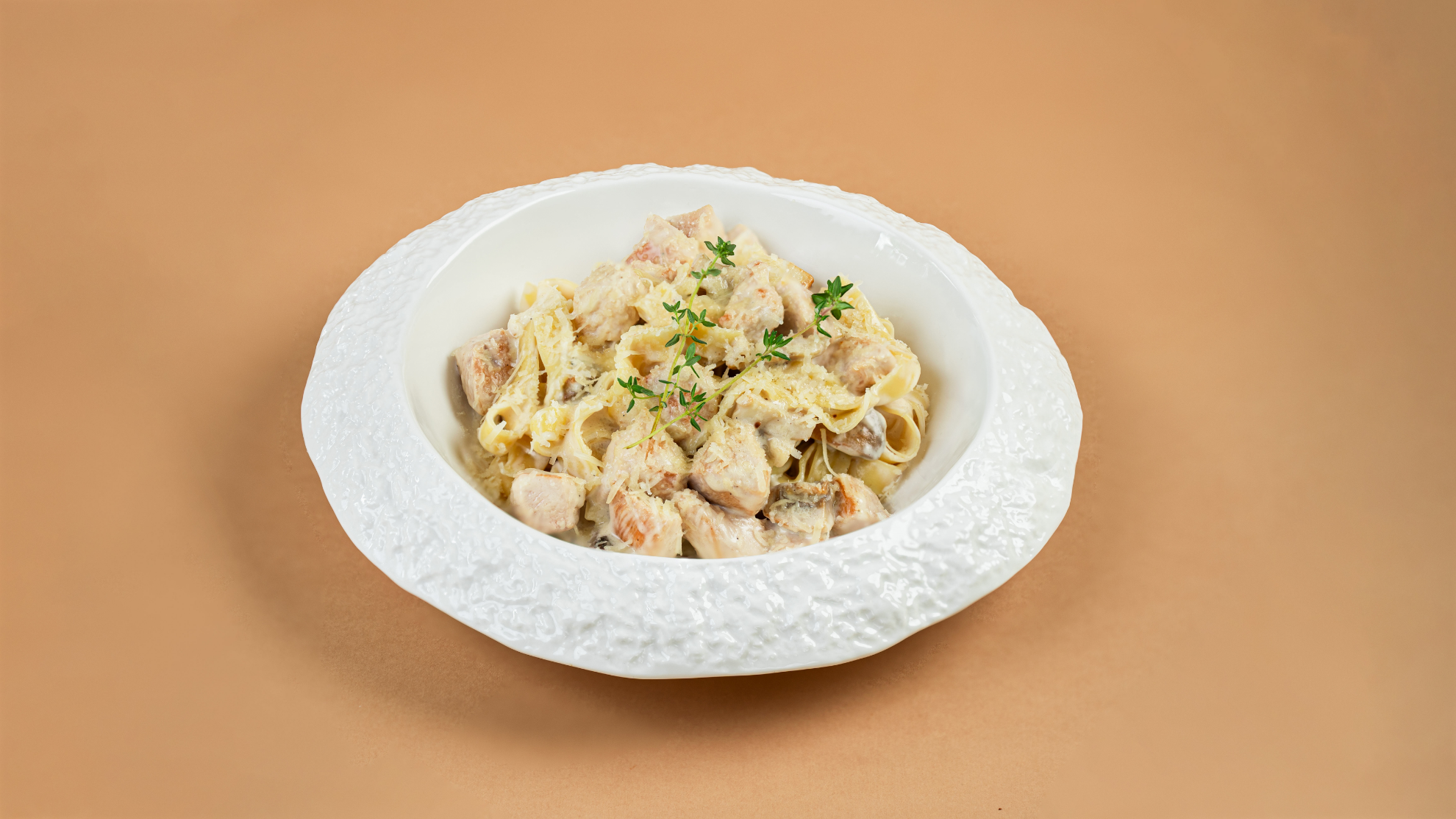 Chicken breast with champignon mushrooms, parmesan cheese, white wine cream sauce and fresh basil.