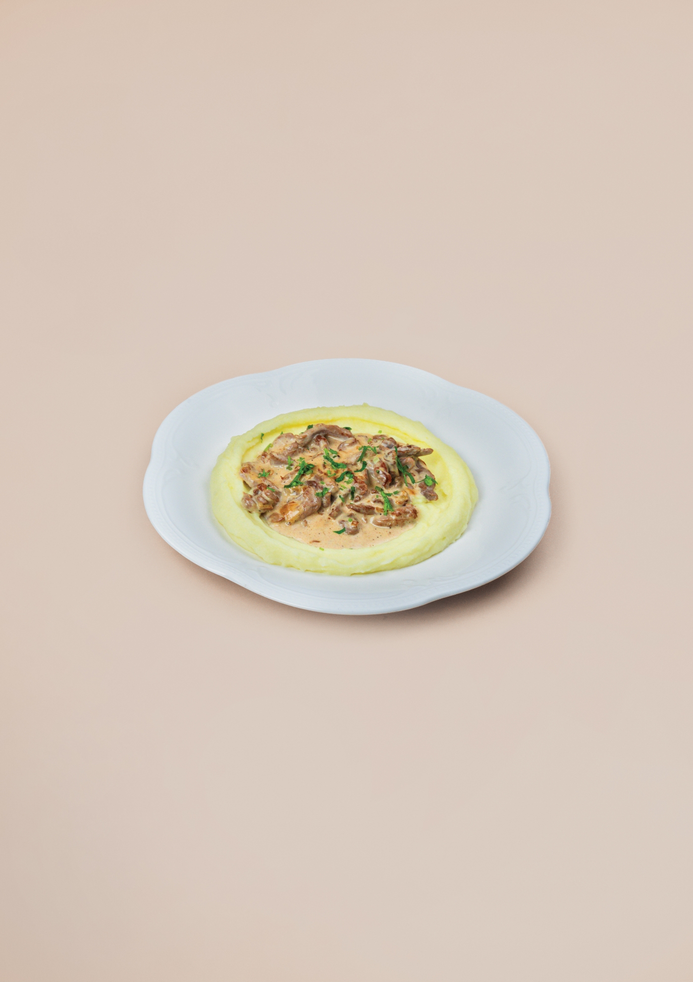 Beef meat, white wine, onion, cream, mushrooms, mashed potatoes