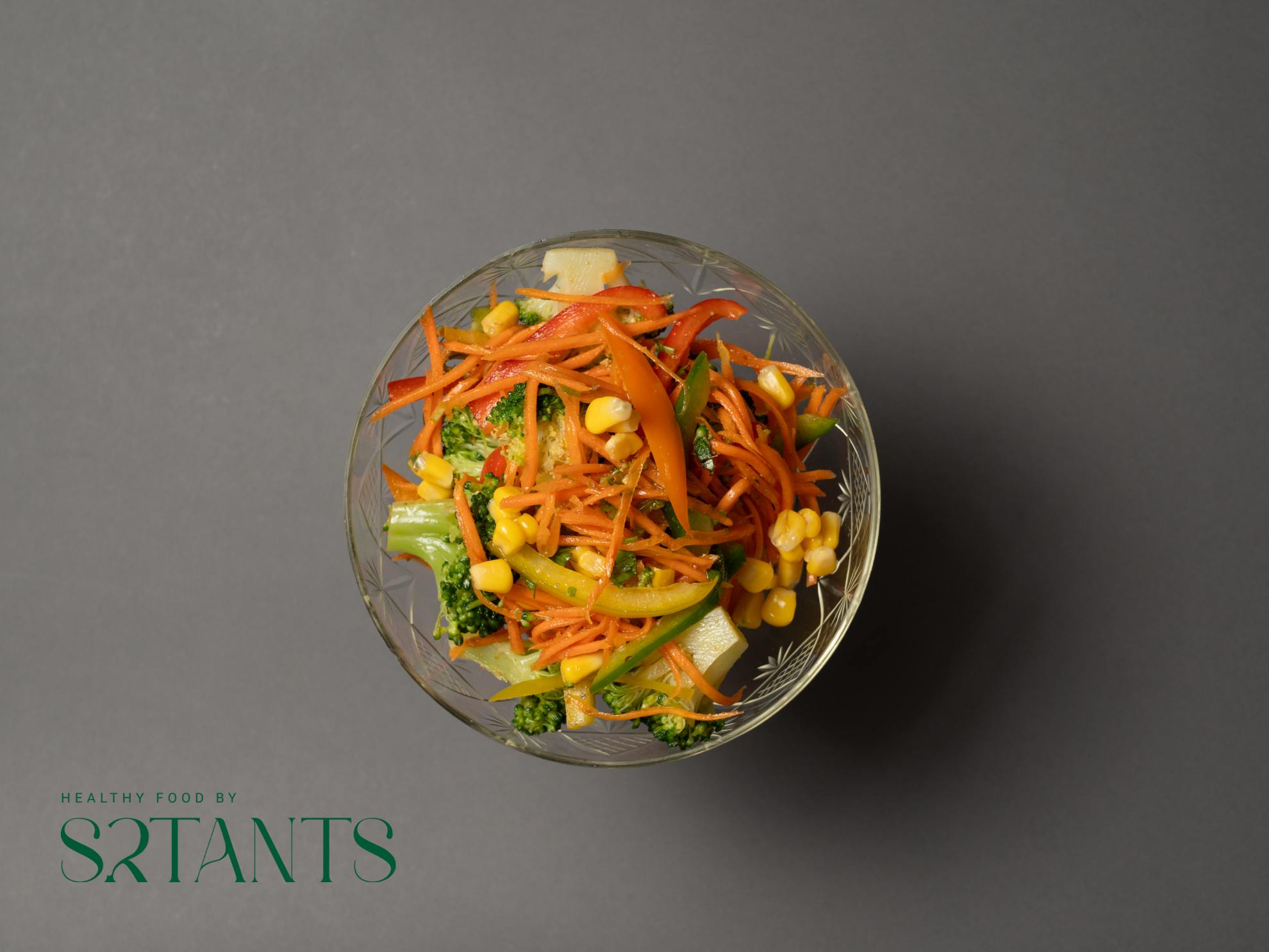 Broccoli, pickled carrot, bell pepper, greens, corn, olive oil, spices