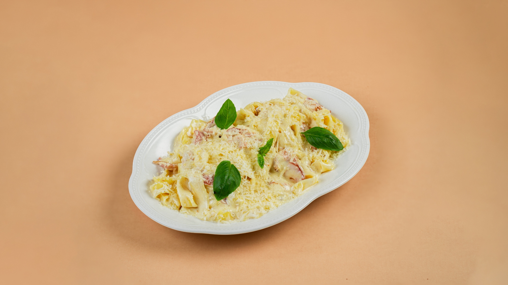 Fettuccine in a creamy, white wine sauce, bacon, egg, parmesan cheese and fresh basil.