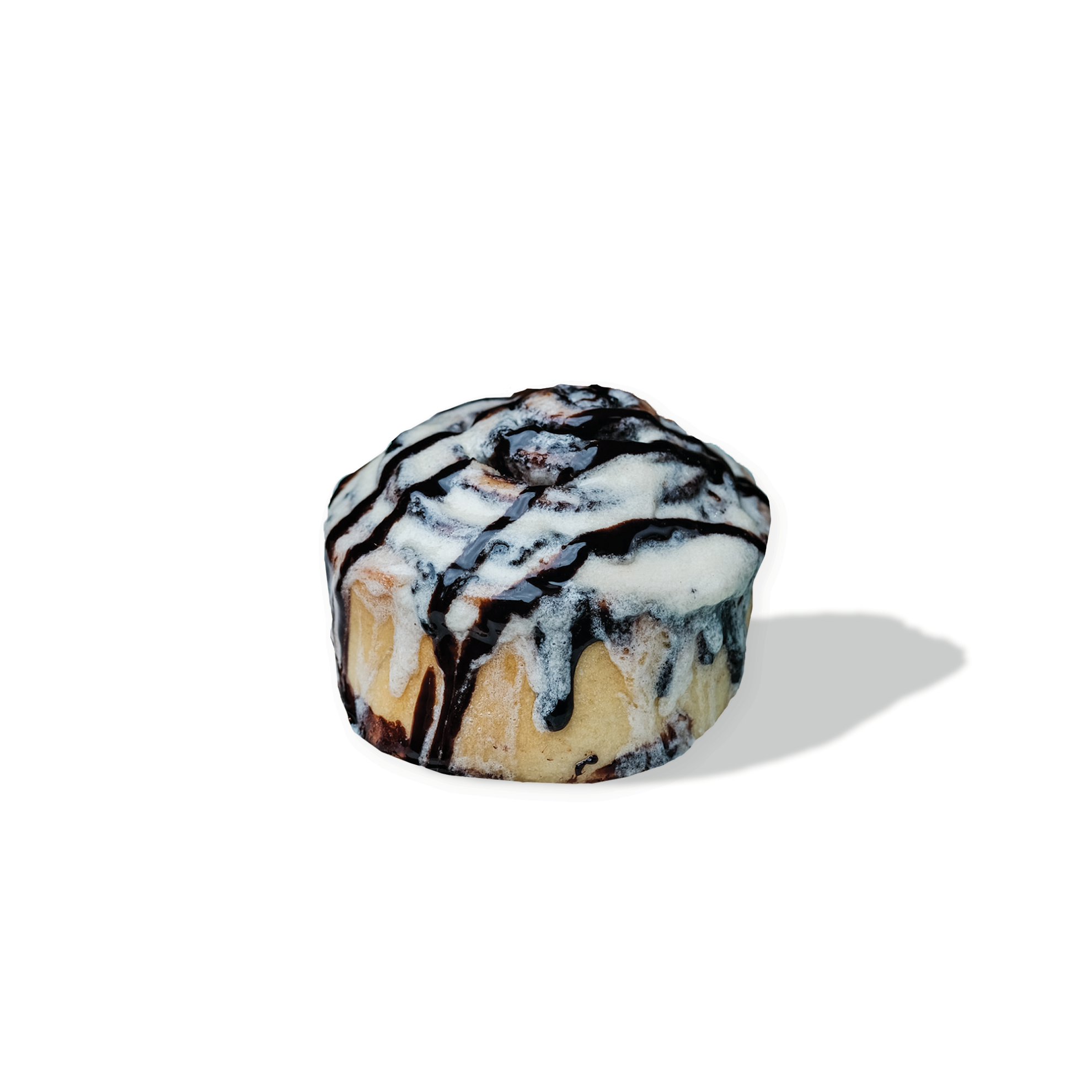 Warm pastry filled with chocolate, topped with fresh cream cheese frosting and chocolate sauce.