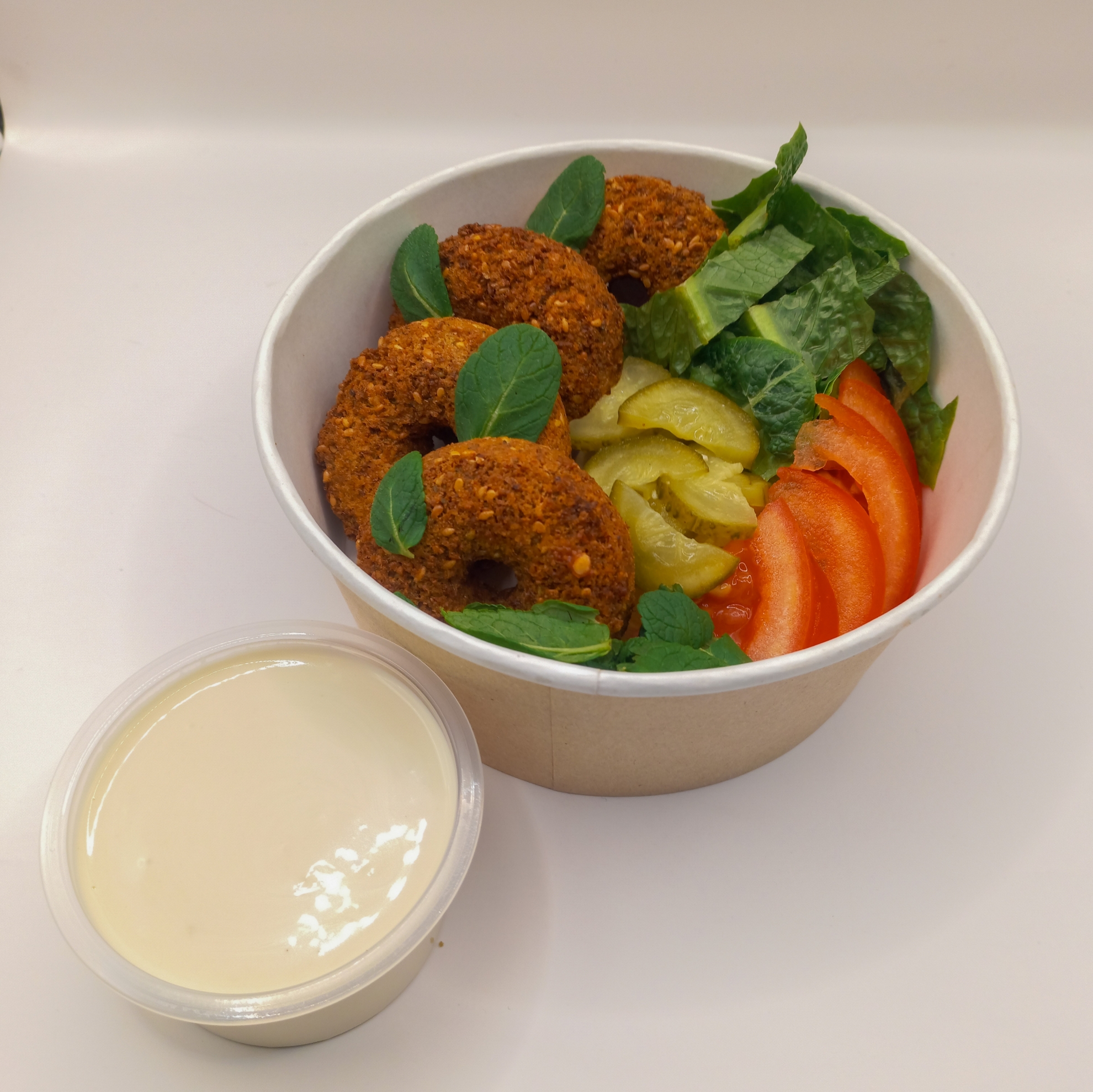 Falafel, tomato, pickles, mint, lettuce, tahini sauce