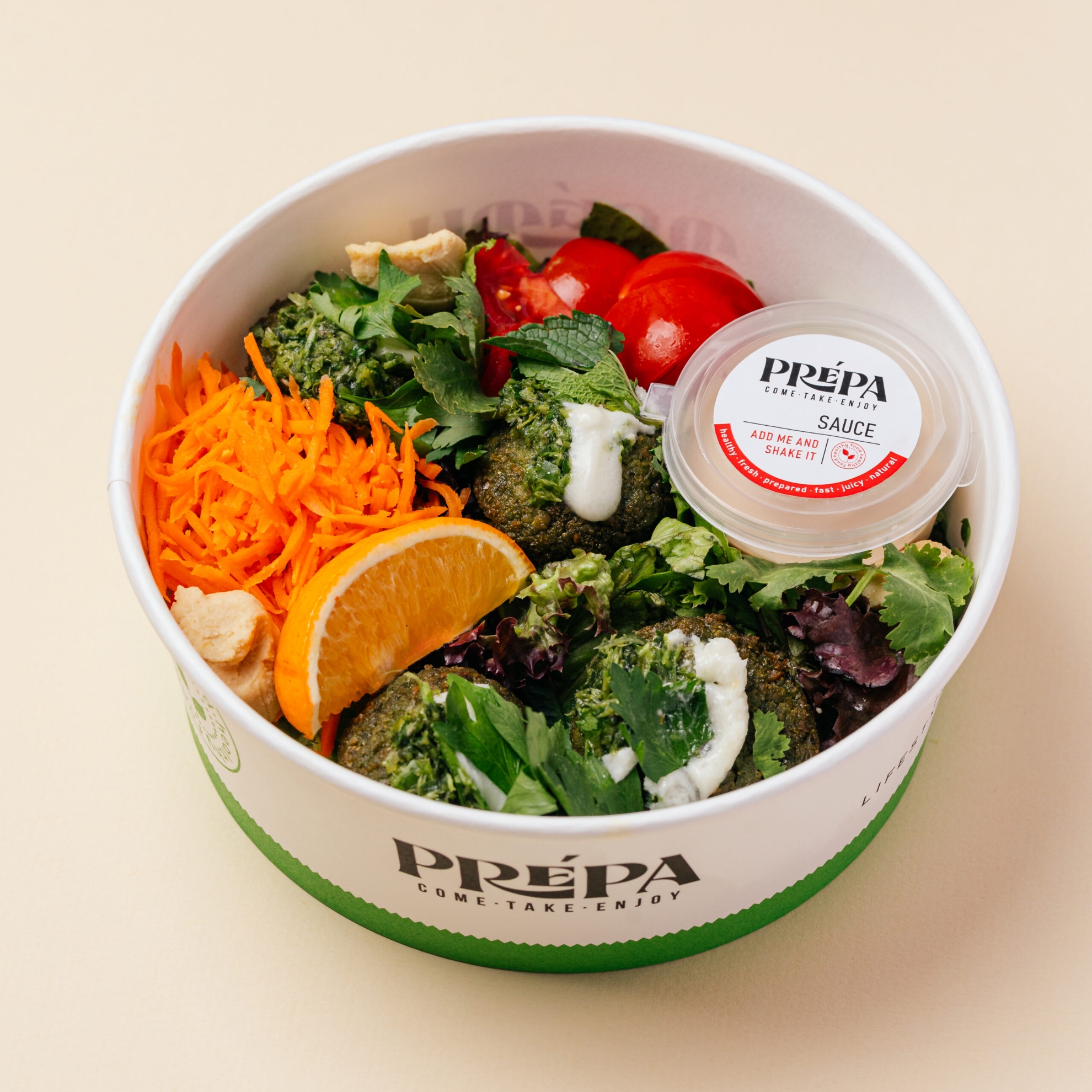 Falafel, onion, carrot salad, cherry tomatoes, hummus, almond flakes, tahini sauce with sesame
