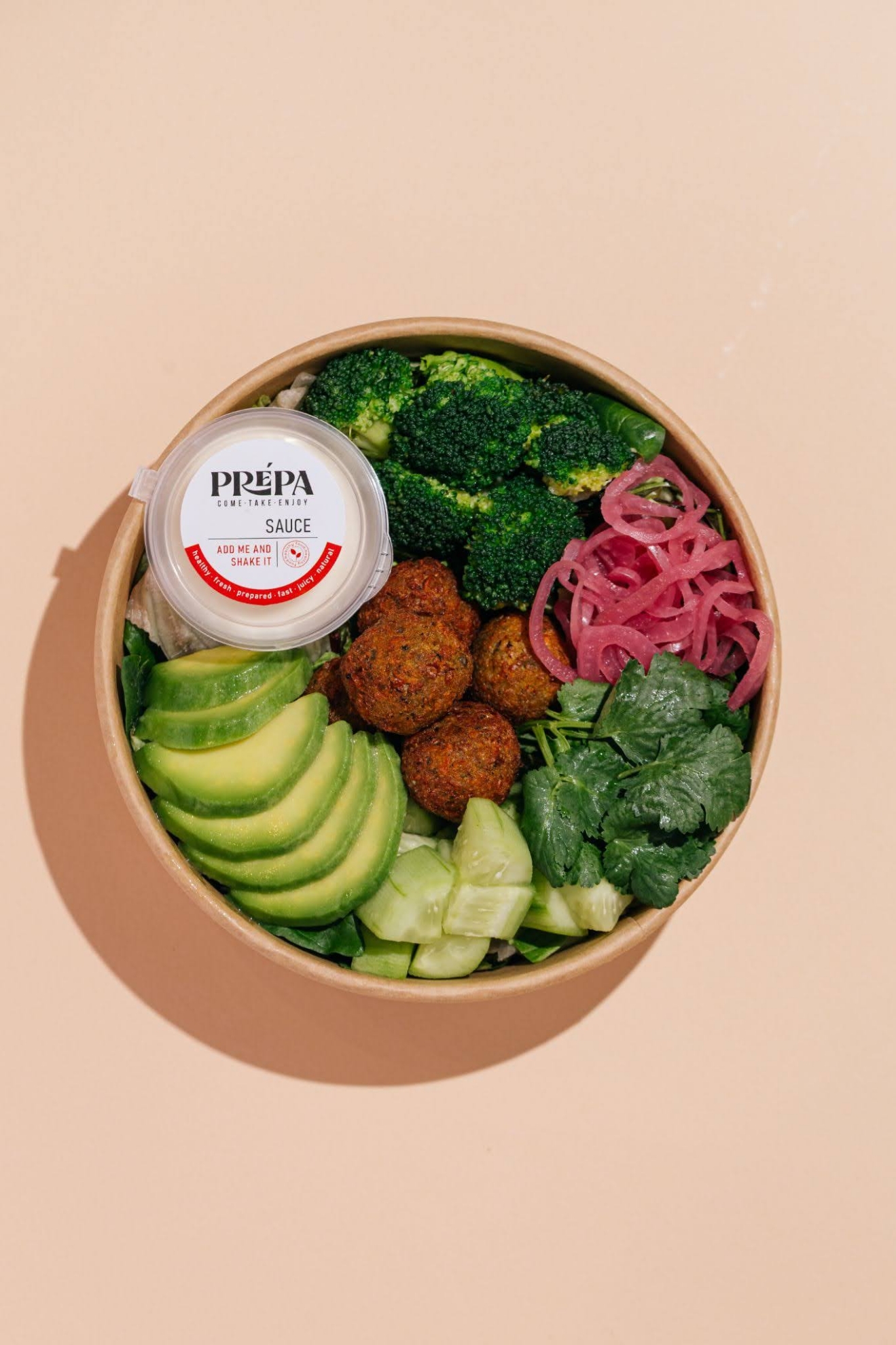 Falafel, avocado, broccoli, cucumber, pickled onion, cilantro, tahini sauce