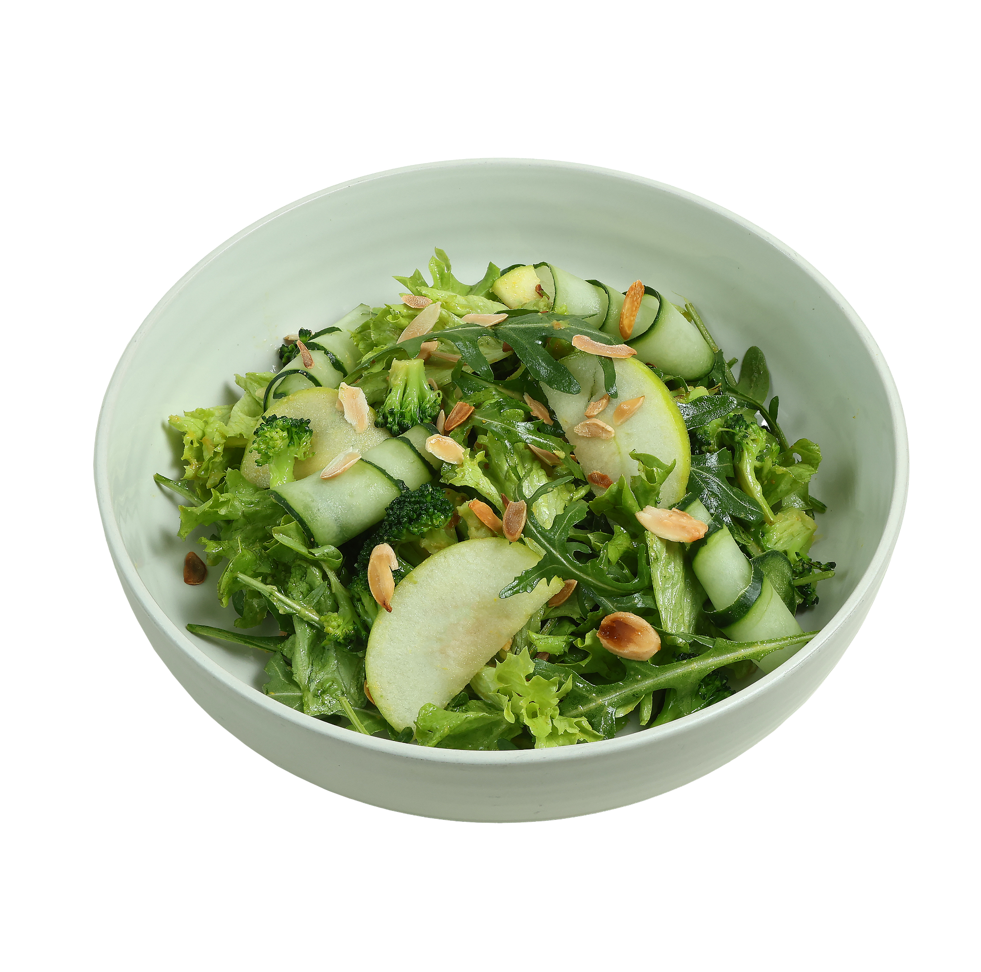 Almond flakes, apple, avocado, broccoli, cucumber, lettuce, mint, arugula, special sauce