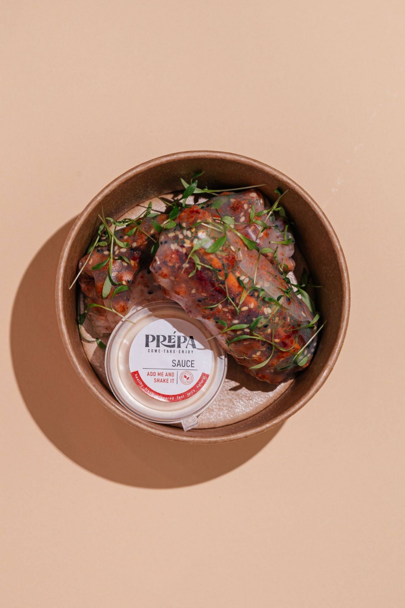 Rice paper, cucumber, carrot, beetroot, tomato confit, roasted chickpeas, baby spinach, tahini creamy sauce (almond yogurt, almond butter, tahini, sweet chili sauce)