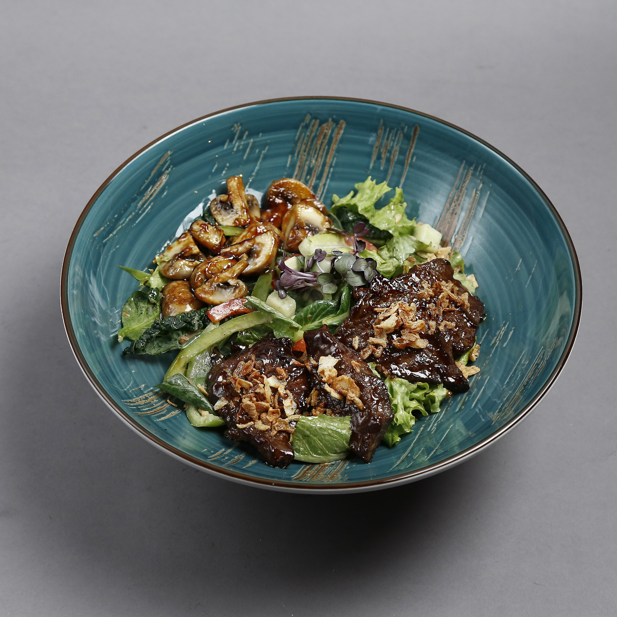 mushrooms, bell pepper, cucumber, beef tenderloin, lettuce, teriyaki sauce