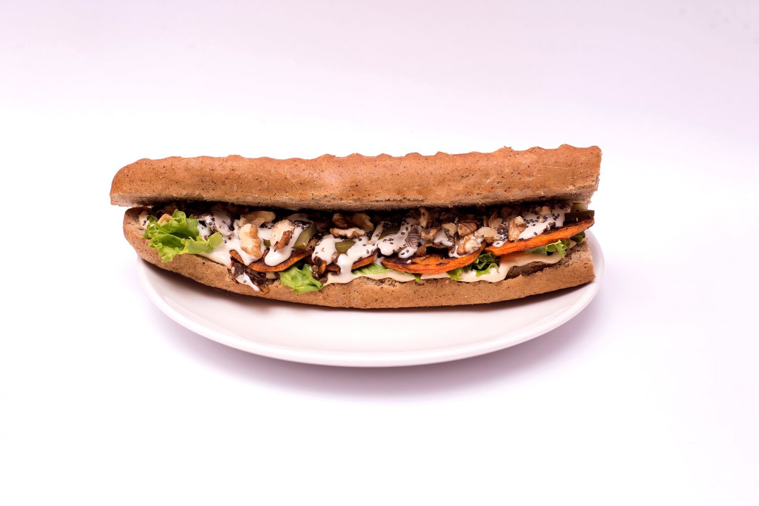 Brown baguette, slices of grilled sweet potato, mushroom, hummus, lettuce, pickles, walnuts and chia seeds
