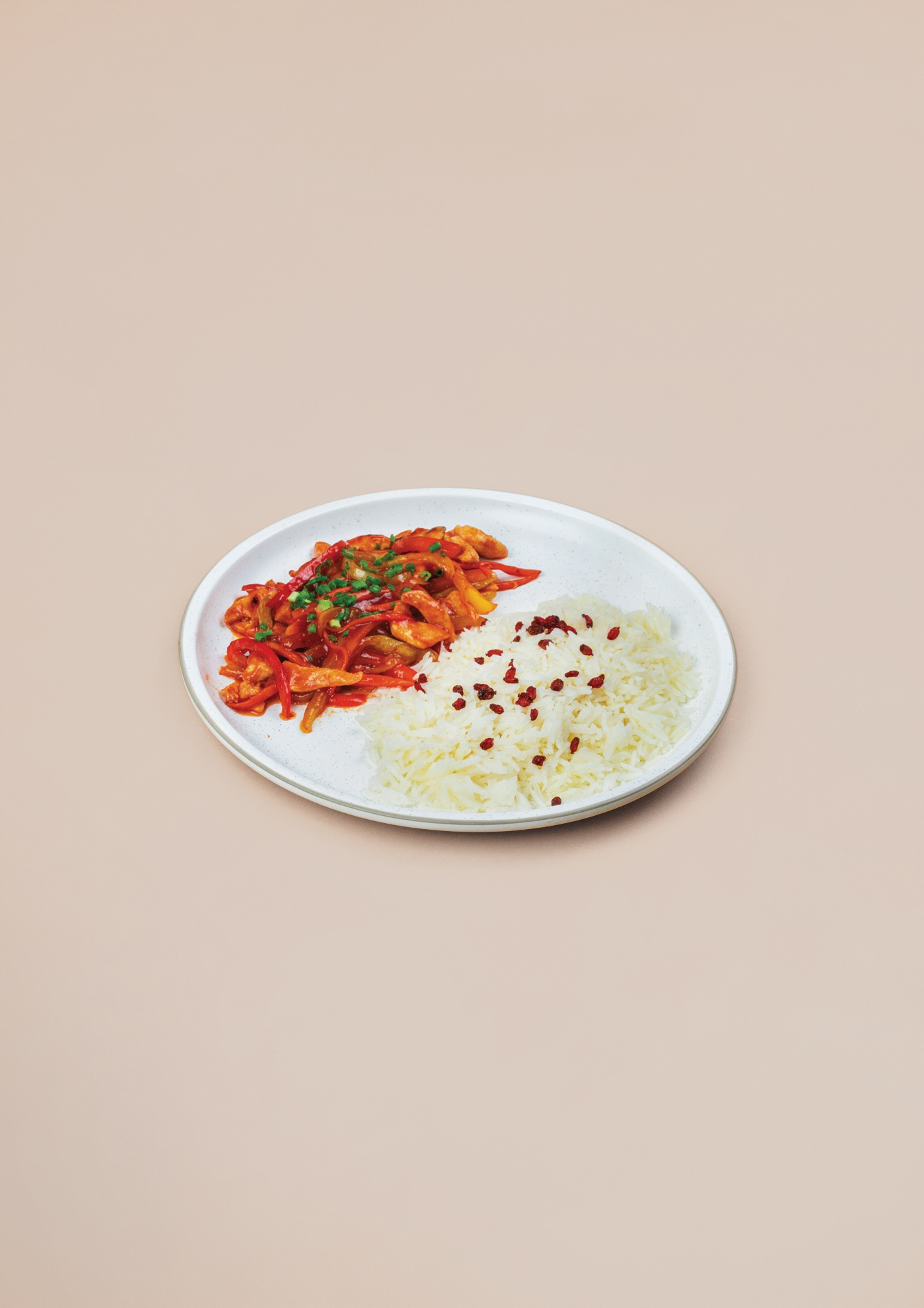Chicken breast, rice, bell pepper, carrot, sweet and sour sauce, barberry
