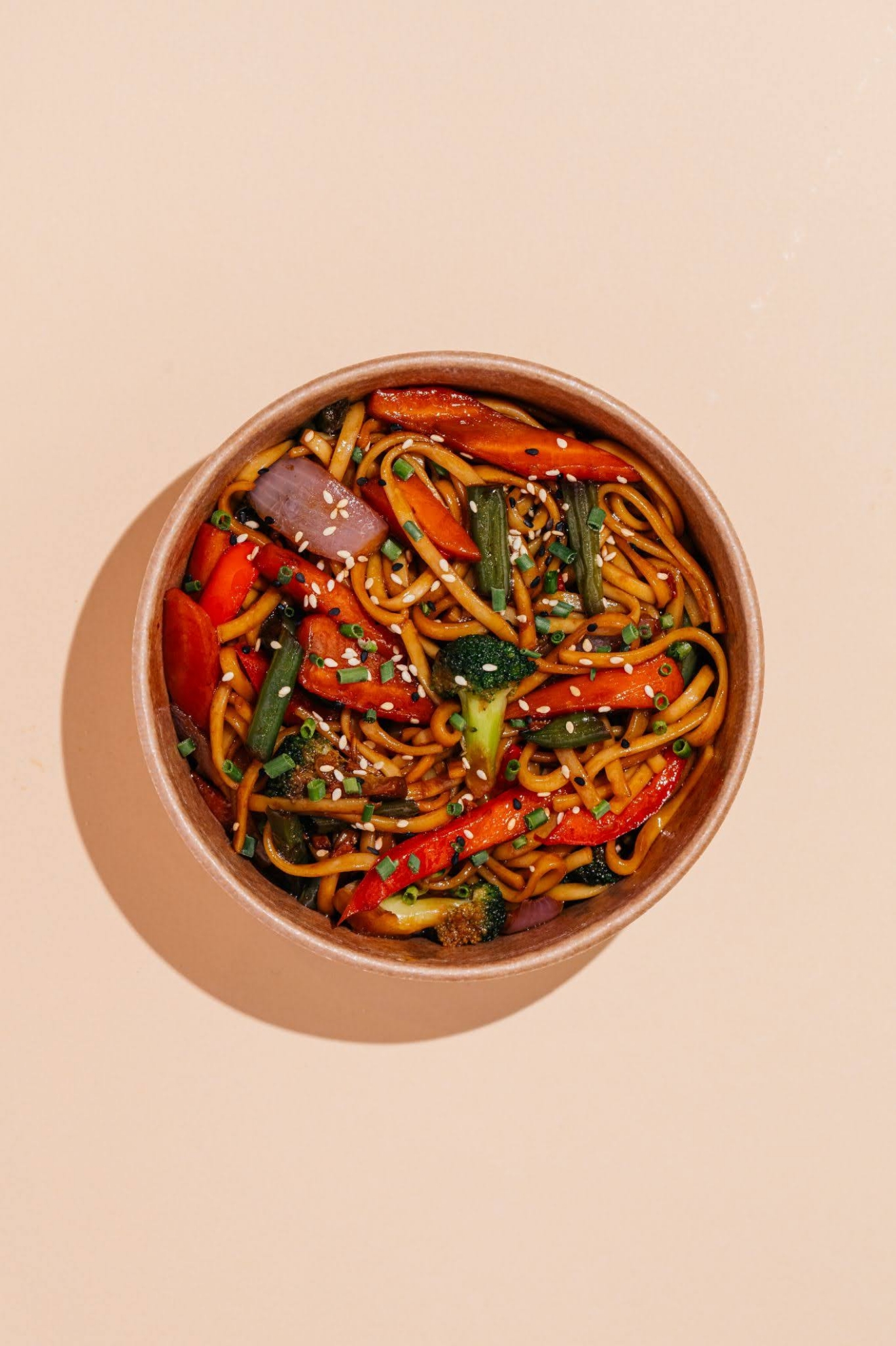 Udon noodles, carrot, bell pepper, broccoli, green beans, red onion, spring onion, chili, ginger, garlic oil, sesame oil, teriyaki sauce, fried onion, sesame seeds